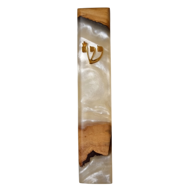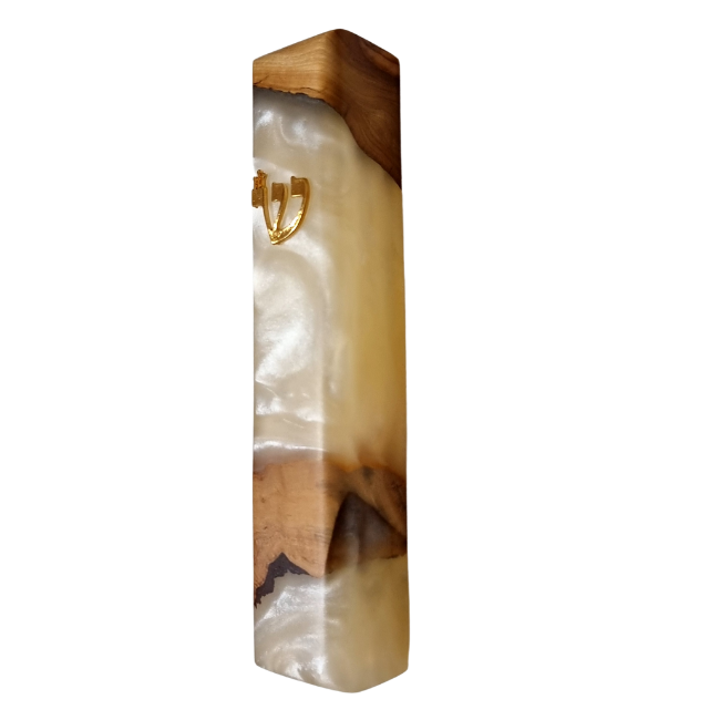 בית מזוזה עשויה בעבודת יד מעץ זית עתיק ואפוקסי בגוון לבן פנינה