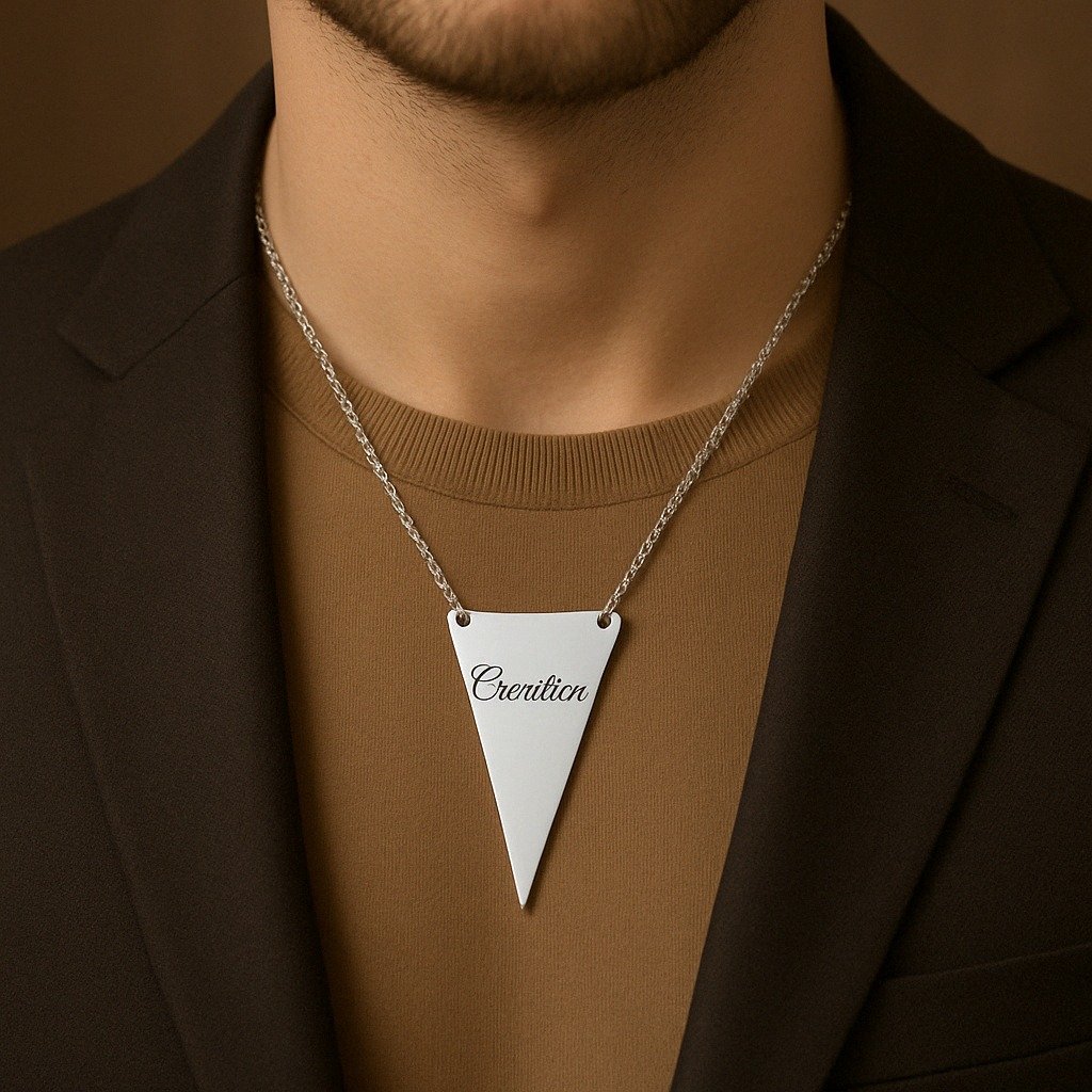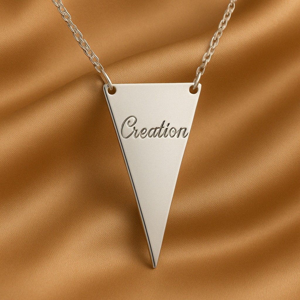 תליון משולש עם חריטה ייחודית שמשדרת ביטחון, יצירתיות ואמירה אישית. מושלם כמתנה עוצמתית או כפינוק אופנתי לעצמך.