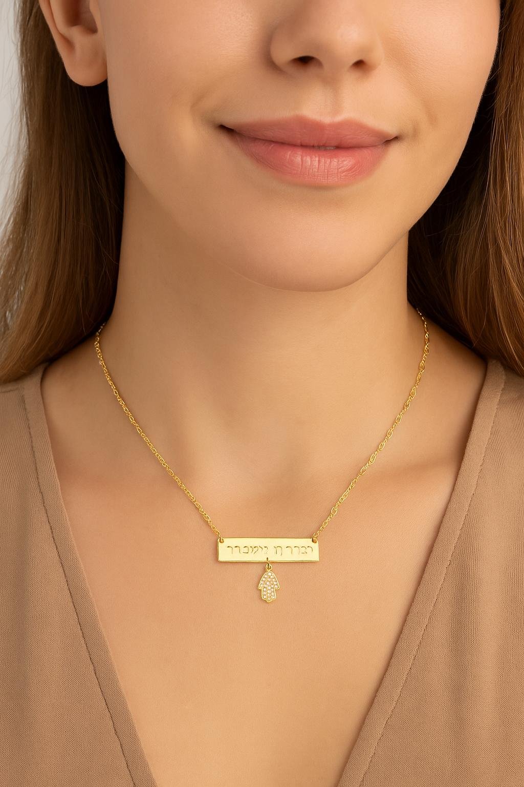 שרשרת לוחית עם חריטה "יברכך ה' וישמרך" או כל חריטה אחר אישית שתרצו וחמסה משובצת – שילוב מושלם בין סטייל אישי לברכה עוצמתית. תכשיט שמשדר גם יופי וגם הגנה רוחנית, ומתאים כמתנה מרגשת במיוחד.